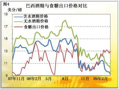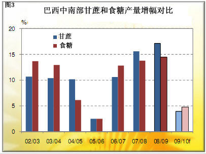 巴西的制糖企业这几年日子并不算很好过,扳起指头数一下,效益最好的年景已经远在3年之前。2007-2008年整整两年里,酒精的收入都远远超出了制糖,本币的一路走强也使得食糖出口收益锐减。但进入2009年之后形势终于发生了转变,制糖的利润高出了酒精;不过,即便是按现在的盈利水平,也不足以刺激企业象2006年那样进行大规模扩张了,如图3所示。前3年甘蔗产量的增幅都在10-17%之间,但今年的增幅仅3.95%。