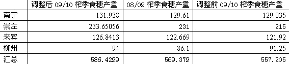 2008/2009榨季与单产调整前后2009/2010榨季食糖产量预测对比表