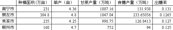 来宾单产调整依据:兴宾区是来宾市的主要产糖区,占来宾市种植面积的61%,兴宾糖办的李主任认为2009/2010榨季的单产要较2008/2009榨季提高0.3吨。上一榨季的产糖率为12.47%,本榨季可能提高0.3%。因此,结合上一榨季的单产水平及兴宾区的单产水平,我们调整来宾市的单产水平为4.25吨/亩,得出其2009/2010榨季的食糖产量预测为126.84万吨,较上一榨季增加4万吨。