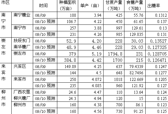 通过为期4天的考察,我们得到了广西四大产区及这些地区所辖部分糖厂和蔗区甘蔗种植面积、单产、甘蔗产量、食糖产量及出糖率的相关数据,为了保持数据的一致性及数据的筛选与剔出,笔者主要根据种植面积、甘蔗产量及出糖率来计算出单产及食糖产量。公式如下:单产=甘蔗产量/甘蔗种植面积、食糖产量=甘蔗产量×出糖率。然后,根据我们调研中了解的单产情况以及对比2008/2009榨季的情况,再对食糖产量进行调整,最终得到广西四大产区的食糖产量预估。公式如下:食糖产量=种植面积×单产×出糖率。