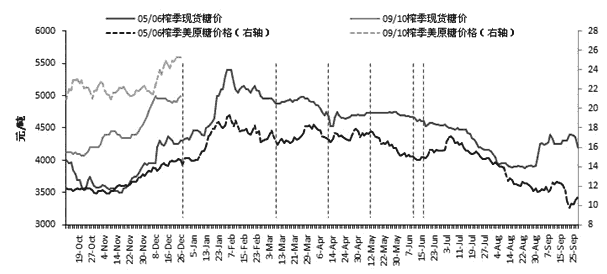 2009/2010榨季初期,在郑州召开的糖会预测产量为1200万吨,消费量为1450万吨,产消缺口预期高达250万吨,而国家食糖储备总量在300万吨左右,盈余仅有50万吨。与2005/2006榨季相比,本榨季之初预期的缺口更大,但国储糖盈余相对较低,因而市场供需状况从价格方向上的反应较2005/2006榨季更早。