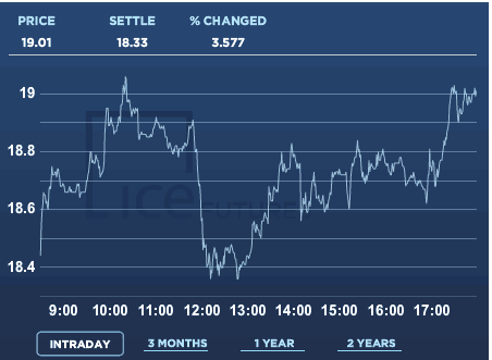 ICE原糖期货周四(18日)收盘反弹上涨,因受到空头回补推动。5月原糖期货收盘上涨70点,或3.6%,报19.03美