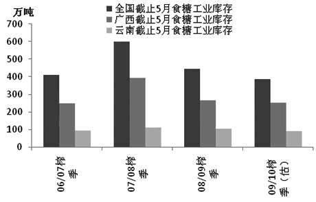 本周中糖协发布了2009/2010榨季截止到5月的食糖产销数据,整体来看5月食糖销量低于预期。但同时较低的工业库存使得糖厂后期销售压力不大,主产区现货基差不断走强反映出厂商的惜售心理。