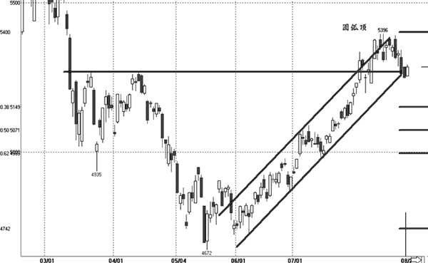 郑糖指数在6月4日针形探底后开启了别开生面的强势上涨行情,自4729点至本月12日的5396点,累计涨幅14.1%。5300—5400区间横盘9日后突然破位下行,5300点和5255点的支撑相继失守。8月9日以来的11个交易日中,收阴7次,糖价跌破上涨趋势线,K线组合显示为圆弧顶,因此糖价短线回调整理的风险加大。技术上测算,此轮白糖指数回调两个重要支撑分别为5275点和5150点,多空双方或将在此点位展开激烈鏖战。鉴于基本面依旧良好,因此看空仅限短线,中长线仍以看涨为主。一德研究院 杨志昌