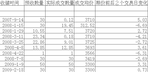 而反向变化的涨跌中,变化幅度超过2.0%的有5次,占反向波动次数的100%比例。变化幅度超过6%有2次,占40%。这2次分别是2008年1月15日和2008年4月22日的收储。由于2008年年度当时的供求关系表现为严重的供过于求状态,当时国内食糖产量创下1484万吨的历史新高。