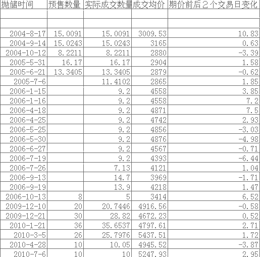 在研究收放储对糖价的短期影响时,统计对象为郑糖指数期价(如果是2006年1月5日白糖上市前的收放储则以广西南宁现货价格为标准)。以下收放储表格中的单位分别为:万吨、万吨、元/吨、%。