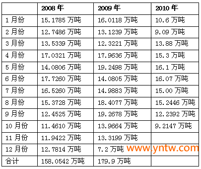 附:云南省2008-2010年各月份食糖铁路外运量对比