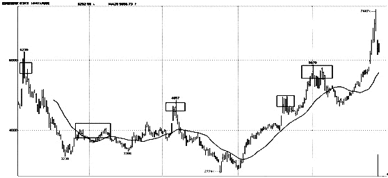 上图是从郑糖上市至今的一个周线走势图。仔细分析,我们同样可以发现非常有意思的现象。第一,从郑糖上市至今年3月,郑糖出现过6次比较明显顶部区域,几乎每次都是以双顶的方式最终确定顶部的形成。第二,双顶的第二个顶一般出现在3月份,概率达到80%。而3月份的月线收阴的概率是60%。