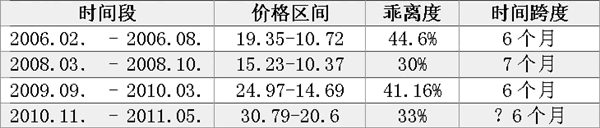 ICE原糖日K线与年线乖离度太大会引发价格回归。从ICE原糖走势可以发现,其每次高点的出现均与年线的乖离度有很大关系。从2006年算起,每当乖离度乖离年线达30%数值以上时,就会出现一次回归并击穿年线,当前已经出现3次。见下表。