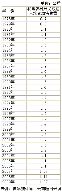我国农村人口近8.5亿,是食糖消费的最主要群体,云南糖网编辑查阅国家统计局最新数据库,整理出1978-2009年我国农村居民家庭人均食糖消费年度统计表,数据显示最近8年我国农村居民每年人均食糖消费量维持在1.1-1.2公斤。