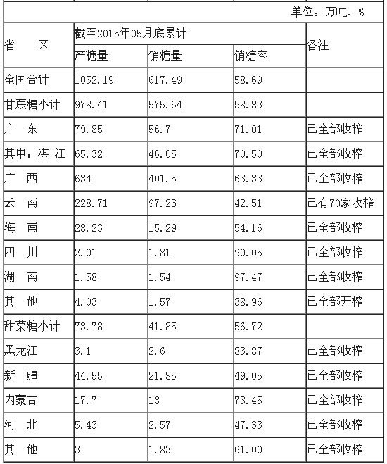 2014/15年制糖期生产已进入尾声,除云南还有几家糖厂生产外,其余省区糖厂均已停榨。 截至2015年5月底,本