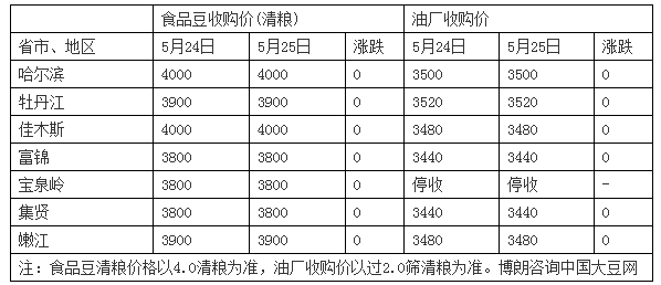 5月25日北方大豆价格趋稳运行,各地净货收购价格集中在3920-4000元/吨,车板价4040-4100元/吨区间,40%蛋
