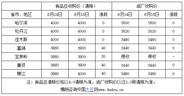 6月15日北方大豆价格稳中小幅上涨,其中佳木斯、双鸭山区域市场价格上调20-40元/吨,绥化局部地区车板价上