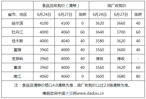 今日东北地区大豆价格坚挺上行,黑龙江北部、中部以及西部各个主要产区价格普遍上涨,净粮收购主流报价4060-4120元/吨区间,车板价4160-4240元/吨区间,较上周相比上调40-60元/吨。