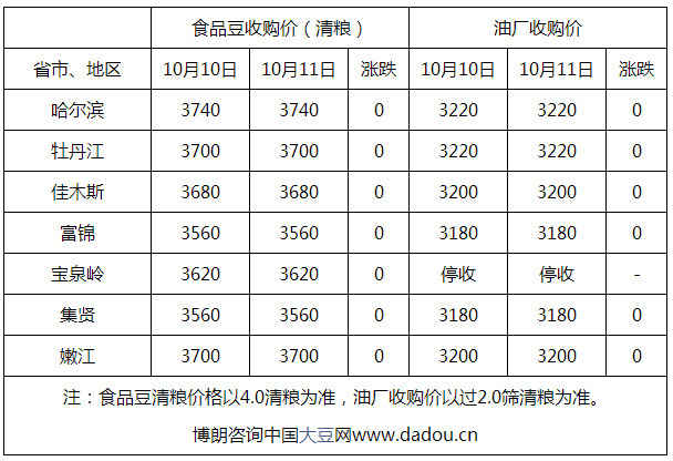 10月11日东北地区市场表现较为平静,各地新豆已经批量上市,但基层购销并不如往年一样火热,农民忙于秋收