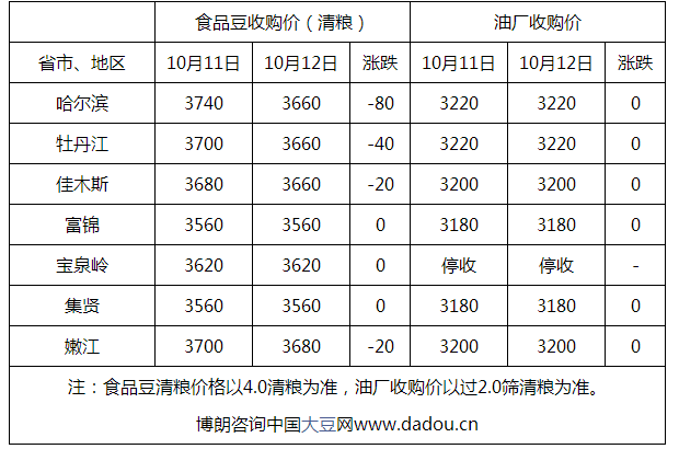 首页市场行情豆类 豆类 10月12日东北部分地区大豆收购价格 大连商品交易所网站 2016-10-14 09:45 豆类 10月12日东北地区购销寡淡局面延续,市场有价无市,购销双方入市脚步迟疑,普通商品大豆价格较前几日相比 10月12日东北地区购销寡淡局面延续,市场有价无市,购销双方入市脚步迟疑,普通商品大豆价格较前几日相比无异,收购价集中在1.75-1.85元/斤,车板价1.85-1.95元/斤,市场优质优价特征继续体现。 小粒芽豆价格有所上涨,因豆农惜售以及销区采购量增加,目前产地装车价格3.1-3.25元/斤,较前期上涨1毛左右。南方市场行情趋稳,蛋白厂继续收购但提价热情不高,使得基层价格滞涨企稳。 上一篇10月11日东北部分地区大豆收购价格10月11日东北地区市场表现较为平静,各地新豆已经批量上市,但基层购销并不如往年一样火热,农民忙于秋收 上一篇10月17日东北地区大豆价格保持稳10月17日东北地区大豆价格保持稳定,市场净粮收购价格大体在3500-3700元/吨,塔豆外销价格集中在3600-3800 相关文章 全国绿豆价格10-17 8月11日全国绿豆价格 中储粮粮库收轮换大豆价格上调 东北豆行情“普涨” 11月3日东北部分地区大豆价格行情 10月31日东北部分地区大豆价格行情 10月27日东北部分地区大豆价格行情 10月26日东北部分地区大豆价格行情 25日东北部分地区大豆收购价格行 10月24日东北部分地区大豆价格行情 10月21日东北部分地区大豆收购价格行