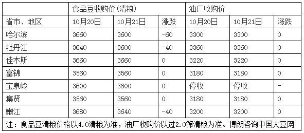 10月21日东北产区大豆市场价格稳中偏弱调整,各地购销趋于冷清。 商品大豆市场购销活跃度较低,目前净粮收