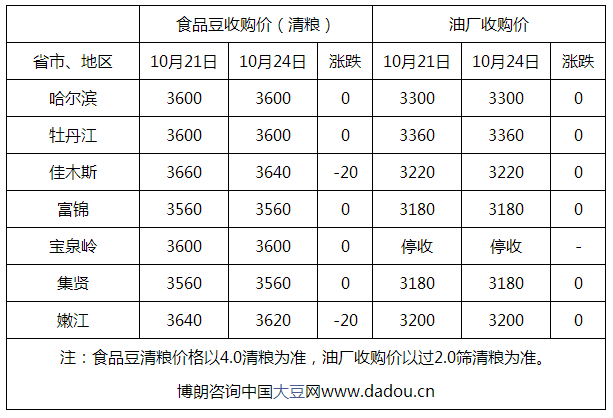 10月24日东北地区大豆行情没有明显变化,商品大豆收购价格集中在3500-3600元/吨区间,塔豆外销价格集中在3
