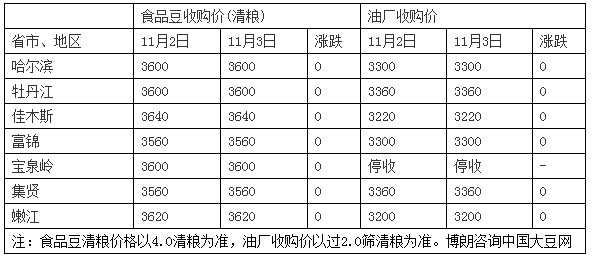 11月3日东北产地大豆收購与外销价格没有明显调整,净粮收購价格集中在3500-3600元/吨,车板价3700-3800元/吨区间,交投显冷清。
