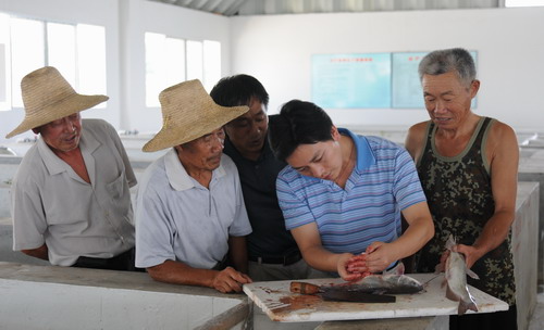 (图为8月29日,在仙桃市水产技术推广中心匙吻鲟良种基地,顾泽茂博士正解剖鲜鱼,为渔民们现场分析鱼的肝胆综合症的症状。)