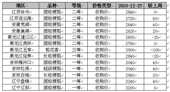 本周,大型集团粳稻收购积极性总体下降,在东北地区还有压价现象。12月27日,黑龙江五常地区,受国家政策调控,及稻米外销困难的制约,部分集团停止收购,而维持生产企业继续下调报价,其中东方集团、中粮等价格不变,在农民手中出米率60%收购价东方1.90元/斤、中粮1.92元/斤,均下调0.05元/斤,华粮停收。佳木斯地区大集团企业收购价稳定(质量要求严格,有压价现象),出米率70%水分16.5%益海、北大荒收购价1.42-1.43元/斤,持平。江苏盐城射阳地区益海出米率68%粳稻收购价1.42元/斤,上涨0.02元/斤;民营企业爱民米业出米率66%水分18%以下收购价1.42元/斤,中粮1.43元/斤,均上涨0.03元/斤,价格上涨的主要原因是粮源紧张,农户惜售。