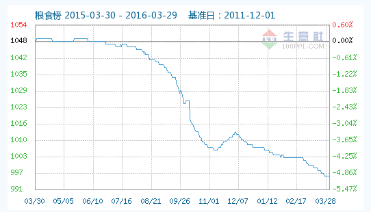 3月29日粮食指数为996点,与昨日持平,较周期内最高点1133点(2013-01-30)下降了12.09%,较2012年01月06日