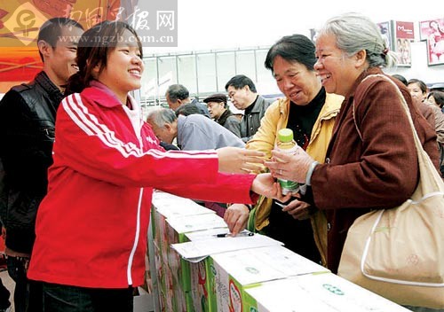 上午9时30分,赠饮活动正式开始。迫不及待的市民们,一手拿着本报刊登的赠饮券,一手在一个本子上签上自己的名字,乐呵呵地领走金银花饮料。家住民主路的李女士笑着说,她提前一天就把刊登在本报的赠饮券剪了下来,22日一早做完晨练后,便直奔赠饮现场。