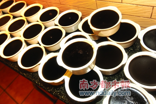位于海珠区洪德路56号的另一家有80多年历史的老字号“耕田公”也被脚手架严严实实地遮起来。店主叶桂妹正在忙着把煎煮好的“老耕田公凉茶”装进铁壶,旁边桌子上,是一排刚做好的龟苓膏。“下雨天,顾客很少。天热的时候,这里可是供不应求”,叶桂妹说。