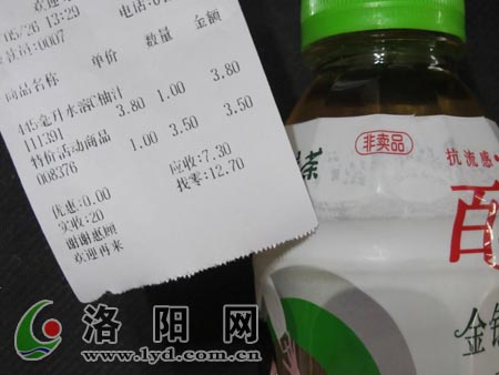 洛阳网5月27日讯 “‘非卖品’拿来当正品卖,商家的做法让人难以理解!”市民吴先生拨打本报热线反映:他在景华路一家超市里花3.5元买了一瓶某品牌的金银花茶饮料,回家后才发现饮料瓶上印有“非卖品”三个字。