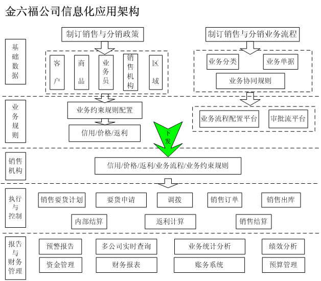 以数据集中管理的系统架构为基础,满足金六福公司通过信息系统配置业务政策、业务控制规则的要求,构建企业经营管理平台,并以平台规范、控制金六福公司营销网络的经营运作。