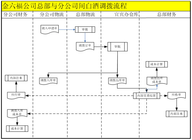 业务协同以下面的产品调拨为例来说明:金六福公司总部与分公司间酒类产品调拨流程