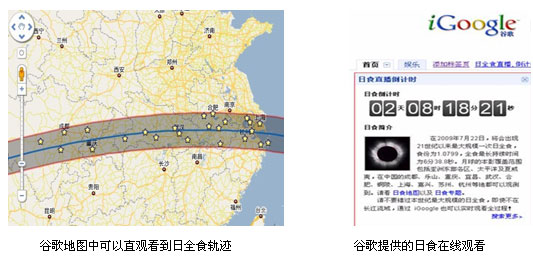 这一次日全食发生时间在9点35分,正值上班高峰时段,普通上班族或者无法亲临观测点,或者无法上网观看,而谷歌个性化首页日食小工具(g.cn/ig)提供了日食专题的点播回看与精彩资讯。谷歌、东方卫视、东方宽频三方联手,通过谷歌个性化首页(g.cn/ig)以及谷歌地图(ditu.google.cn)的网络传播平台,把多点连线现场直播的原生态画面完整呈现给全国亿万用户,为不能亲临观测点的网友提供观看日食的新途径。有超过600万用户选择添加了这个小工具到自己的谷歌个性化首页,185万人通过这一工具观看网上视频直播。