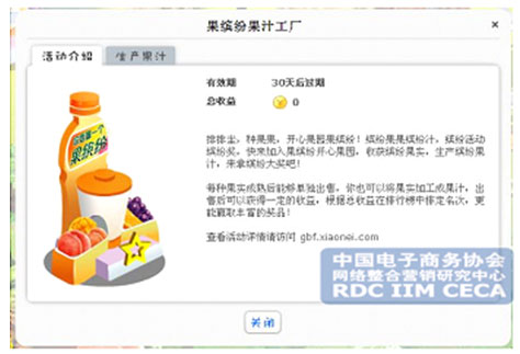 在确定了将在SNS游戏平台进行广告的形式后,果缤纷最终决定在校内网及千橡开心网上火爆异常的游戏“开心农场”中以APP植入的方式进行广告投放,这样的话,果缤纷植入的游戏性极强,会在很大程度上消除用户的警戒心,拉近同用户的距离,很自然地将自己的产品同游戏结合在一起。