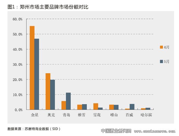 以前,河南郑州市场向来只有金星啤酒与奥克啤酒的对决,如今,随着各大啤酒巨头的渗透,“双英对决”正在演变成“四强混战”。金星啤酒的市场份额降幅最大,5月份降到50%以下,四大渠道都有不同程度的下降,尤其以传统渠道下滑幅度最大;而奥克啤酒也遭遇了同样的困境,市场份额下滑到20%左右,传统渠道和现代渠道齐齐下滑,虽然餐饮渠道能维持小幅上升,但高档餐厅的市场份额却在大幅下降。华润雪花啤酒也有明显的下滑,雪花啤酒和奥克啤酒的一同下滑反映出因收购带来的市场不稳定因素,整合和对接的快慢进程决定了市场的下滑程度。