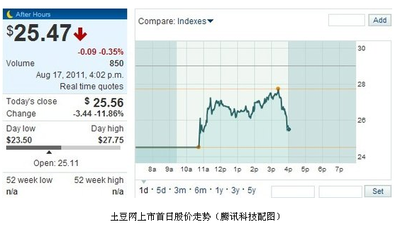 美国当地时间8月17日,土豆网成功登陆纳斯达克市场,交易代码为“TUDO ”,开盘价25.11美元,较发行价29美元下跌13.41%。截至收盘,土豆网报价25.56美元,较发行价下跌11.86%。盘中该股成交价最低为23.50美元,最高为27.75美元。