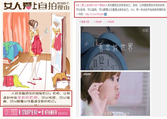 (朵唯“女人爱上自拍的100个理由”与美图秀秀手机产品推广微博)