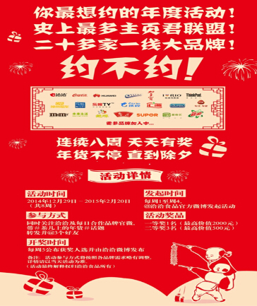 洽洽食品联合众品牌跨界营销,发起茶几上的年货活动,玩一次任性的活动。从活动发起日到除夕,连续八周,
