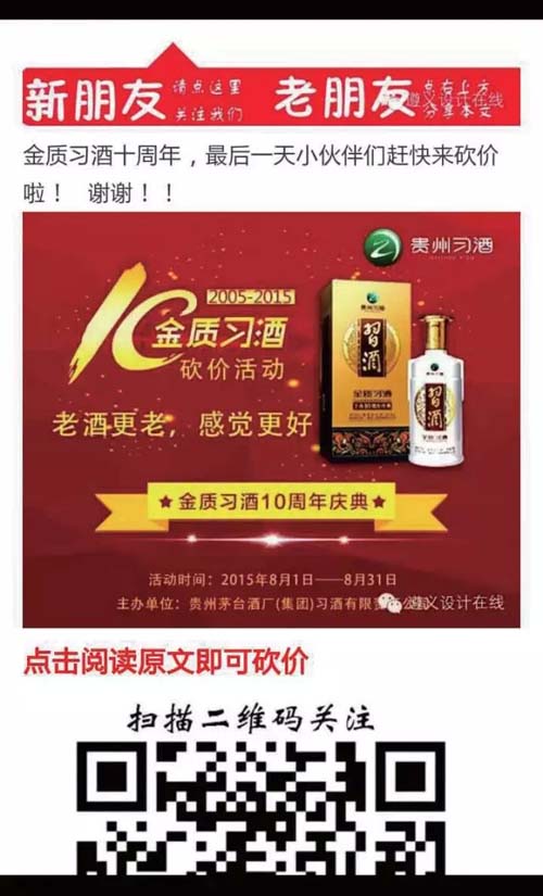 营销动作:2015年,为拓展习酒的品牌知名度和向广大消费者传达金质习酒十年品牌市场的品质理念,习酒特别通过线上以微信为主的电商平台及线下贵州63个市场开展了这场为期一个月的终端砍价推广活动。在线上推广方面,习酒一方面通过自己官方的微信、微博等平台以及贵州地区的“微盟”平台,以活动转发、推送等方式传播“金质习酒十周年庆典——老酒更老,感觉更好”的线上参与点赞、转发砍价优惠的活动。几乎在一夜之间,一则“人在江湖,哪有不挨刀的!”请求砍价的消息,便在贵阳市民的朋友圈中扩散开来,市场价200多元一瓶的金质习酒可从1400多元邀请朋友圈“砍价”至0元(最多6瓶),市民只需支付20元运费,产品即可送到家中。另一方面,利用媒体进行广告投放作前期活动宣传造势,其中餐饮店 1003 家,零售终端637家,发布易拉宝339个,桌卡4895个……,使得全贵阳地区的消费者,都知道了这场即将到来的“全民砍价”活动。