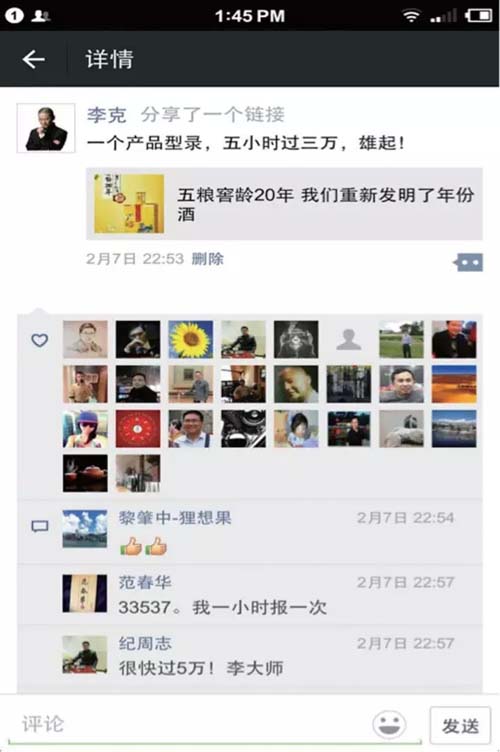 以“小圈”口碑引发滚动传播:在“小圈”口碑形成后,李克开始引导微信用户把焦点转移到随时间而增长的产品手册阅读量上,并在朋友圈中进行不间断地刷新,使用户有了参与感和量化感。除此之外,李克还在关键节点处循序渐进地设置了大量的奖励刺激,如突破五万即送酒、突破十万即送价值4000元的毛氏雪茄等。而在传播热潮告一段落后,李克又通过产品“迭代升级”信息的透露等方式,很好地达成了传播的延续。