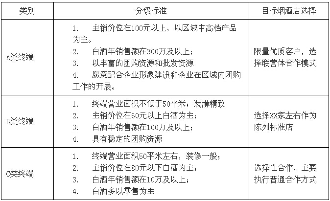 3、店面检查:观察店面产品陈列、销售档次,确定主推产品询问是否给企事业单位供酒和所供产品;观察并询问是否代理其他品牌(主要竞争对手的),如果没有则继续谈判;如果发现代理竞品,则放弃谈判。
