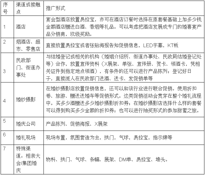 三是,婚纱影楼联合促销:在婚纱影楼悬挂xx婚庆用酒指定专卖点标示,品尝酒及产品陈列,以及联合促销政策广宣品(婚宴用xx酒达到多少,在本店拍婚纱照可享受几折优惠,在本店拍婚纱,购买xx婚宴酒可享受几折优惠,企业补足差额,或婚庆公司成功介绍酒婚宴,每联系一家予以奖励)。