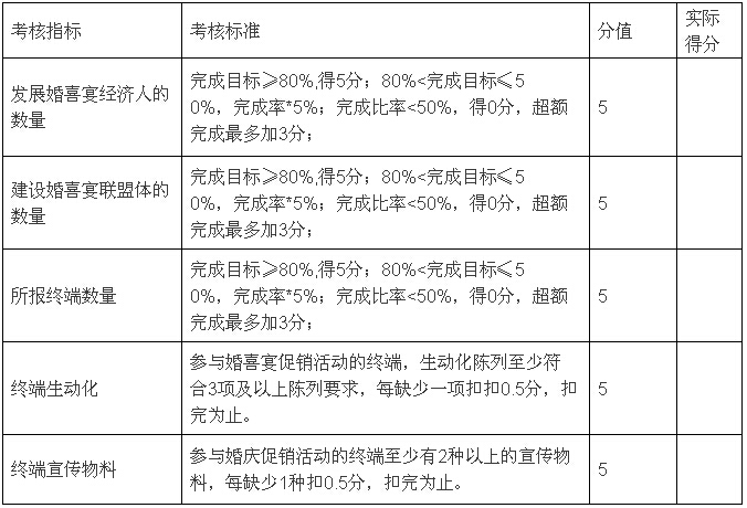 根据婚庆喜宴的关键动作制定质化考核指标,作为当月的重点工作考核,并与业务员的绩效考核挂钩,如下表