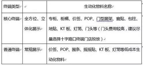 终端物料生动化是实现品牌势能提升,使产品成为终端最耀眼、最强势的明星,吸引消费者注意,最终促进产品销售的必备武器。合理使用公司资源,根据公司给予的费用情况和终端的重要程度进行精准投放。