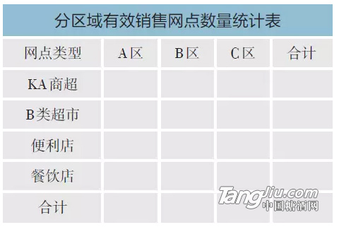 明确了有效销售网点的标准,接下来企业便组织人力、物力对样板市场进行市场调研,根据标准确定有效销售网点的总数量。根据不同渠道和区域,为有效销售网点制成一张统计表(见下表)。