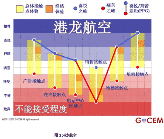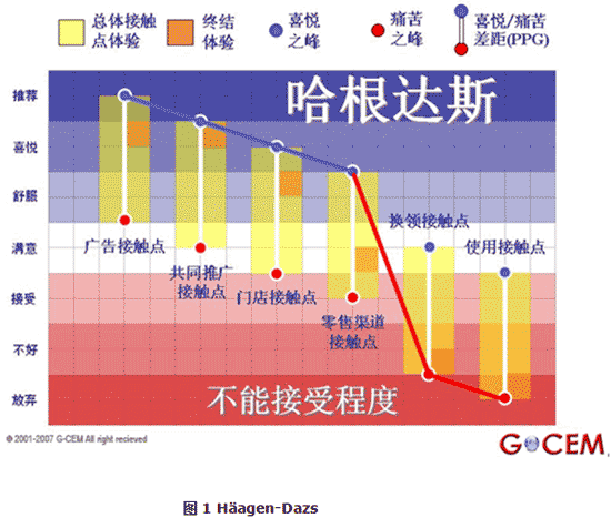 图1和2是我“享用”Häagen-Dazs产品和拜访港龙航空售票处的情感曲线。如果这类客户体验于企业具有相当高的重要性那么你就要从相对不太重要的接触点那儿调配资源来提升这些体验。要问我底线?很简单:不要让任何接触点上的体验掉到可接受水平之下!