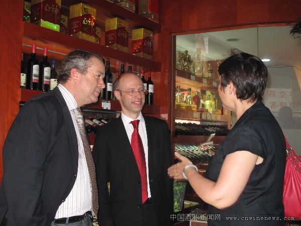法国驻华大使馆农业参赞孟玛丽女士、法国卡斯特兄弟股份有限公司总经理阿兰·卡斯特先生与法国卡斯特兄弟股份有限公司中国区总经理毕杜维在考察温州葡萄酒市场。