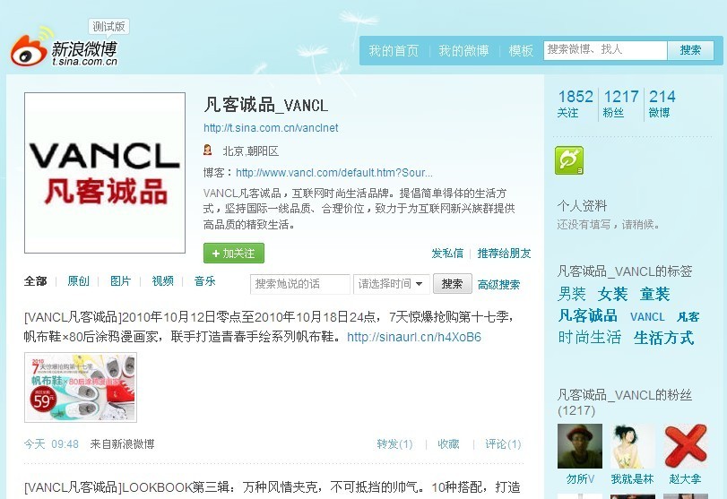 除此以外,你还能看到VANCL畅销服装设计师讲述产品设计的背后故事,看到入职三月的小员工抒发的感性情怀,对于关注话题中检索到的网民对于凡客的疑问,VANCL幕后团队也会在第一时间予以解答。VANCL品牌管理部负责人李剑雄告诉记者,虽然从目前来看,微博的营销效果很难评估,但是相应的投入也很少,只要细心经营,微博对企业形象的构建、品牌内涵的宣扬的意义不言而喻。