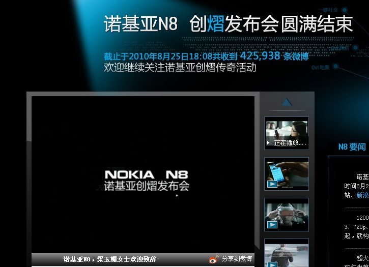 诺基亚首款搭载Symbian^3系统的手机——诺基亚N8在8月25日上午采用全新微博直播的方式线上发布。8月25日上午10点30分,诺基亚联合新浪微博、人人网、开心网和优酷网的全社交网络发布会开幕。直播会当天,新浪微博首页推出诺基亚N8手机“微博发布会”,7小时内即收到微博评论、转发89034条,诺基亚新浪微博首页关心人数到达49277,被业内称作品牌营销的又一成功案例。