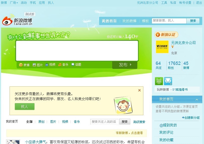 微博客的突然流行使公司与消费者的沟通真正变得“个性化”、“7×24小时”、“全透明”,这看起来极度接近服务的最终追求,却实实在在地对公司营销能力构成了挑战。相比传统的SNS、BBS和个人博客,微博的传播速度和范围都要大得多。我们知道社交网络是建立关系的场所,互动和服务是关键词。因此,在微博上寻找话题和目标人群,锁定关键字,找到潜在粉丝主动沟通,这都是公司在微博上可以方便完成的事情。元洲装饰公司就巧妙使用了这一策略。