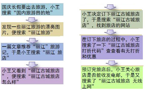 可以看到上面的流程图,首先,要想在网上预订酒店的客户,需要对目标关键词进行搜索,其次是通过品牌的探索,新渠道的发现,品牌的信任度,最后才是下订单,并有机会进行回访,增加信任。